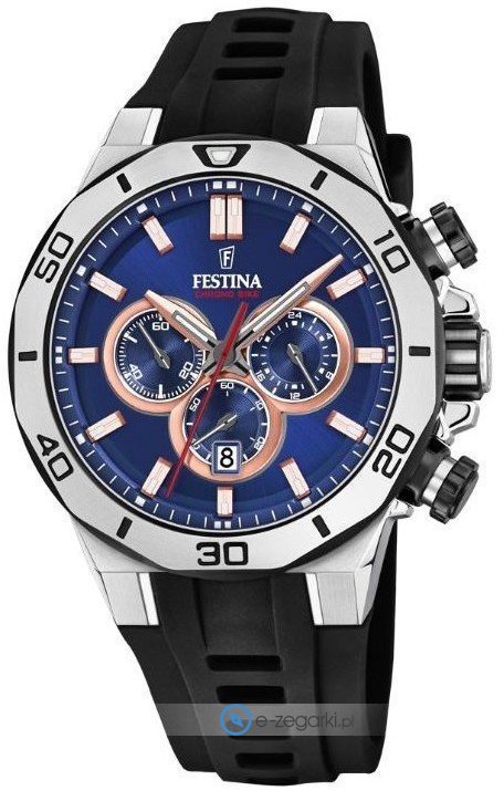 Zegarek męski F20449-1 marki Festina z rodziny Festina Chrono Bike. Charakterystyczny wygląd czasomierza uzyskano m.in. poprzez cyferblat w kolorze niebieskim. Godzina przedstawiona jest w sposób analogowy co intuicyjnie pozwala ją odczytać. Koperta została ozdobiona kolorem srebrnym szeroka jest na 44 mm oraz ma grubość 14 mm - posiada okrągły kształt.