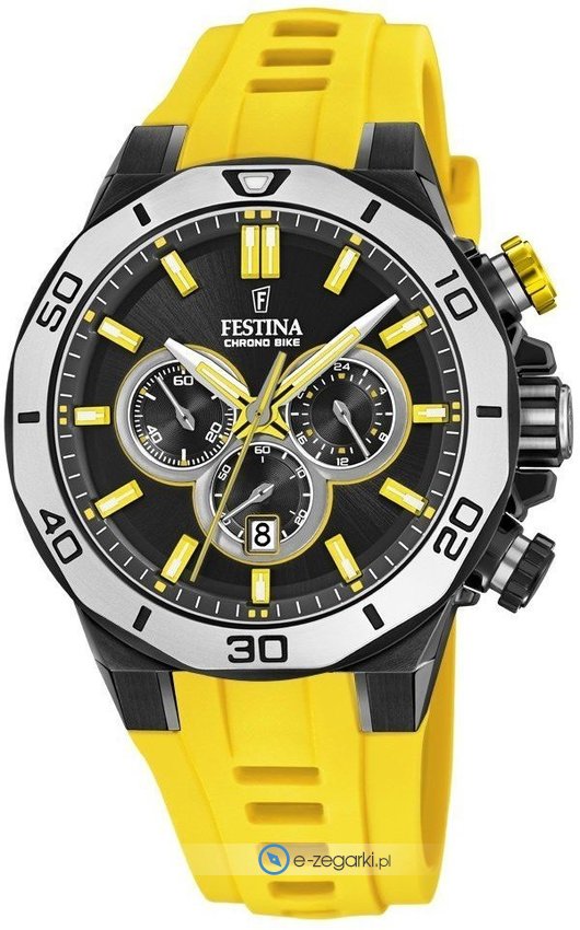 Zegarek męski F20450-1 marki Festina z kolekcji Festina Chrono Bike. Ciekawy wygląd czasomierza uzyskano także dzięki tarczy w kolorze czarnym. Zegarek ten pokazuje godzinę w formacie analogowym dzięki temu odczyt jest intuicyjny. Koperta jest pokryta kolorem srebrnym szeroka jest na 44 mm oraz ma grubość 14 mm - w kształcie okrągłym.