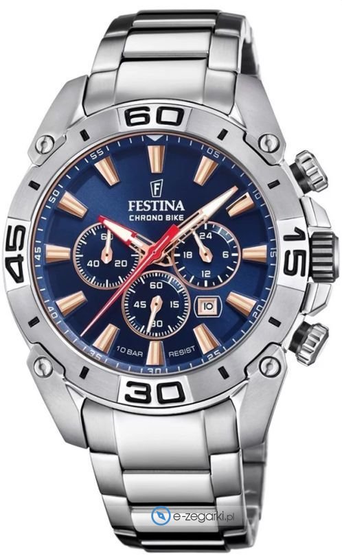 Zegarek męski F20543-4 marki Festina to stylowe połączenie funkcjonalności a także ciekawego designu. Model ten w gamie innych zegarków tego producenta występuje w kolekcji Festina Chrono Bike. Tarcza zegarka jest w kolorze niebieskim. Zegarek ten prezentuje aktualny czas w formacie analogowym dzięki czemu odczyt jest bardzo łatwy. Koperta w odcieniach koloru srebrnego szeroka jest na 47 mm - w kształcie okrągłym.