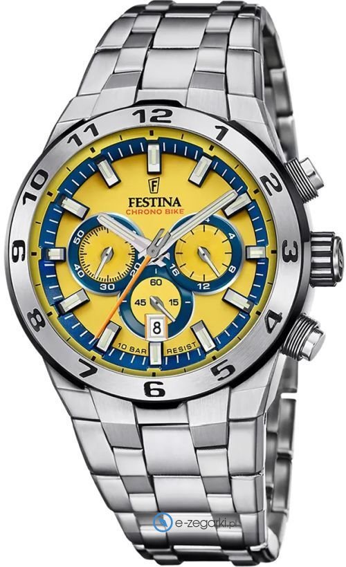Zegarek męski F20670-4 marki Festina z kolekcji Festina Chrono Bike. Charakterystyczną budowę zegarka uzyskano z pomocą tarczy w kolorze żółtym. Godzina prezentowana jest w sposób analogowy co intuicyjnie pozwala ją odczytać. Koperta w odcieniach koloru srebrnego szeroka jest na 44 mm oraz ma grubość 13 mm - ma okrągły kształt.