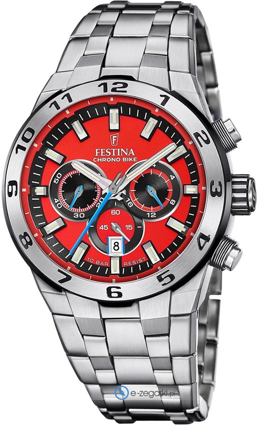 Zegarek F20670-5 marki Festina to gustowny zegarek naręczny męski, który jest wyposażony w ciekawe rozwiązania i funkcje. Model ten występuje w kolekcji Festina Chrono Bike. Tarcza zegarka jest w kolorze czerwonym. Godzina pokazywana jest w sposób analogowy co niezmiernie łatwo pozwala ją odczytać. Koperta w odcieniach koloru srebrnego szeroka jest na 44 mm oraz ma grubość 13 mm - charakteryzuje się okrągłym kształtem.