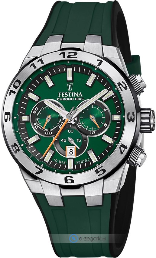 Festina F20671-2 - męski zegarek kierowany dla osób szukających zegarka z kolekcji Festina Chrono Bike. Niebanalny wygląd czasomierza uzyskano m.in. poprzez cyferblat w kolorze zielonym. Pokazana metodą analogową bieżąca godzina jest czytelna i szybka do odczytania. Koperta jest w kolorze srebrnym szeroka jest na 44 mm oraz ma grubość 13 mm - ma okrągły kształt.
