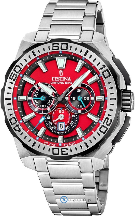Zegarek męski F20724-5 marki Festina to dobre połączenie funkcjonalności i ciekawego designu. Model ten należy do kolekcji Festina Chrono Bike. Atrakcyjny wygląd czasomierza uzyskano m.in. poprzez cyferblat w kolorze czerwonym. Zaprezentowana metodą analogową aktualna godzina jest czytelna i łatwa do sprawdzenia. Koperta jest w kolorze srebrnym szeroka jest na 45 mm oraz ma grubość 14 mm - posiada okrągły kształt.