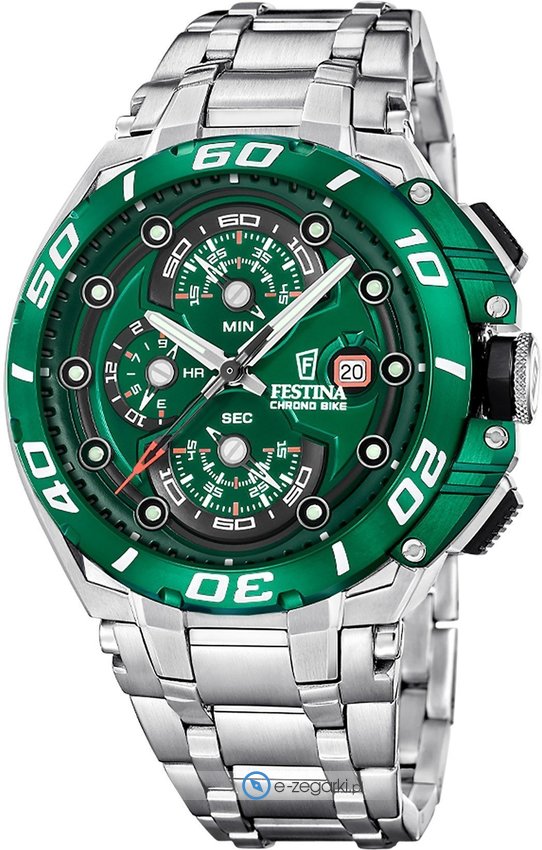 Zegarek męski F20754-5 marki Festina to esencja sportowego stylu i funkcjonalności, zamknięta w eleganckiej formie. Model ten, jak i inne zegarki tego producenta, przynależy do popularnej serii Festina Chrono Bike. Czasomierz wyróżnia się zielonym cyferblatem, który nadaje mu unikalnego charakteru i zapewnia doskonałą czytelność wskazań. Analogowy odczyt godziny jest intuicyjny i szybki, a szeroka na 46 mm koperta podkreśla męski charakter zegarka.