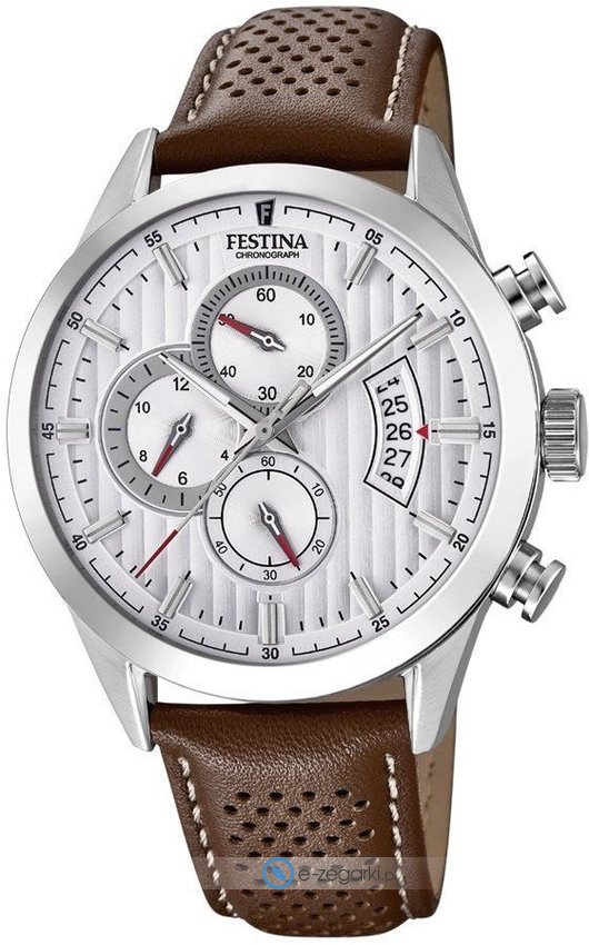 Festina tego brandu raczej nie trzeba specjalnie prezentować. To lubiana i ceniona praktycznie na całym świecie marka zajmująca się produkcją czasomierzy, która narodziła się początkiem XX wieku w szwajcarskiej miejscowości La Chaux-de-Fonds. Od czasu kiedy marka weszła w skład nowej grupy Festina Group w latach osiemdziesiątych poprzedniego stulecia stała się bardzo zauważalna. Aktualnie zegarki Festina można dostać w przeszło 50 krajach na świecie. Markę Festina bardzo często można dostrzec na różnego rodzaju imprezach sportowych, np wyścigach kolarskich Tour de France. Wyróżnikiem zgeraków Festina jest posiadanie specjalnego utwardzanego szkiełka mineralnego na które marka udziela osobnej 5 letniej gwarancji. Obecnie twarzą marki jest znany i ceniony aktor Gerard Butler, można go ujrzeć w wielu spotach reklamowych właśnie z chronometrem Festina.