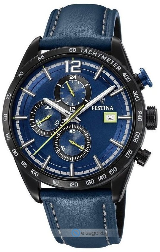 Zegarek męski F20344-2 marki Festina należy do serii Festina Chrono Sport. Wysokiej jakości tarczę zegarka ozdobiono niebieskim kolorem. Godzina zaprezentowana jest w sposób analogowy co intuicyjnie pozwala ją odczytać. Koperta jest w kolorze czarnym szeroka jest na 44 mm oraz ma grubość 12 mm - w kształcie okrągłym.