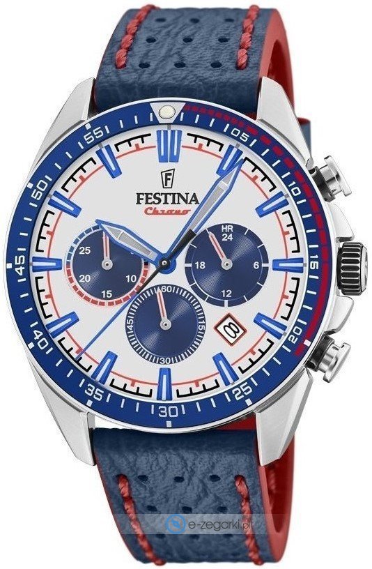 Zegarek męski F20377-1 marki Festina to stylowe połączenie funkcjonalności a także modnego designu. Model ten zalicza się do kolekcji Festina Chrono Sport. Ciekawy wygląd zegarka uzyskano m.in. poprzez tarczę w kolorze białym. Aktualna godzina pokazywana jest w sposób analogowy co intuicyjnie pozwala ją odczytać. Koperta jest pokryta kolorem niebieskim szeroka jest na 45 mm oraz ma grubość 12 mm - ma okrągły kształt.
