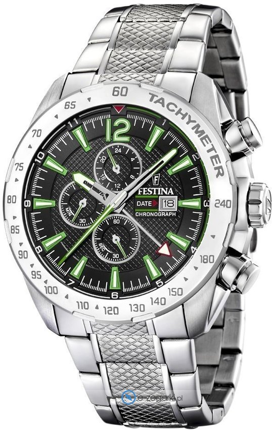 Zegarek F20439-6 marki Festina to elegancki zegarek naręczny męski, który posiada pomysłowe rozwiązania i funkcje. Model ten pochodzi z kolekcji Festina Chrono Sport. Charakterystyczny wygląd czasomierza uzyskano m.in. poprzez cyferblat w kolorze zielonym. Zegarek ten prezentuje aktualny czas w formacie analogowym dzięki czemu odczyt jest bezproblemowy. Koperta jest ozdobiona kolorem srebrnym szeroka jest na 44 mm oraz ma grubość 13 mm - ma okrągły kształt.
