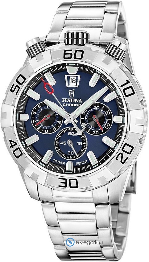 Zegarek męski F20743-1 marki Festina to dobre połączenie funkcjonalności a także ciekawego designu. Model ten zalicza się do kolekcji Festina Chrono Sport. Atrakcyjną budowę zegarka uzyskano dzięki tarczy w kolorze granatowym. Pokazana metodą analogową aktualna godzina jest czytelna i szybka do sprawdzenia. Koperta jest pokryta kolorem srebrnym szeroka jest na 45 mm oraz ma grubość 13.4 mm - w kształcie okrągłym.
