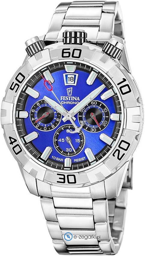 Zegarek męski F20743-3 marki Festina należy do serii Festina Chrono Sport. Niebanalną konstrukcję czasomierza uzyskano z pomocą tarczy w kolorze niebieskim. Aktualna godzina pokazywana jest w sposób analogowy co intuicyjnie pozwala ją odczytać. Koperta jest w kolorze srebrnym szeroka jest na 45 mm oraz ma grubość 13.4 mm - posiada okrągły kształt.