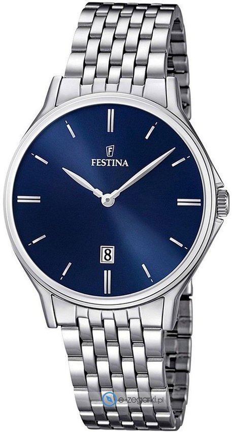 Model męski F16744-3 należy do serii Festina Classic Bracelet marki Festina. Cyferblat zegarka jest w kolorze niebieskim. Zaprezentowana metodą analogową bieżąca godzina jest czytelna i łatwa do odczytania. Koperta została ozdobiona kolorem srebrnym szeroka jest na 39 mm oraz ma grubość 8 mm - w kształcie okrągłym.
