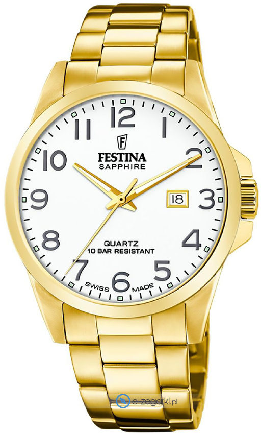 Zegarek F20044-1 marki Festina to stylowy zegarek naręczny męski, który jest wyposażony w pomysłowe rozwiązania oraz funkcje. Model ten należy do kolekcji Festina Classic Bracelet. Charakterystyczną stylistykę czasomierza osiągnięto z pomocą tarczy w kolorze białym. Aktualna godzina prezentowana jest w sposób analogowy co intuicyjnie pozwala ją odczytać. Koperta w barwach koloru złotego szeroka jest na 41 mm - posiada okrągły kształt.