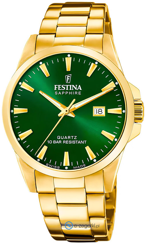 Zegarek męski F20044-5 marki Festina to idealne połączenie funkcjonalności a także modnego wzornictwa. Model ten w gamie innych zegarków tego producenta występuje w serii Festina Classic Bracelet. Atrakcyjny wygląd czasomierza uzyskano również dzięki tarczy w kolorze zielonym. Zaprezentowana metodą analogową bieżąca godzina jest czytelna i prosta do sprawdzenia. Koperta jest w kolorze złotym szeroka jest na 41 mm oraz ma grubość 10 mm - posiada okrągły kształt.