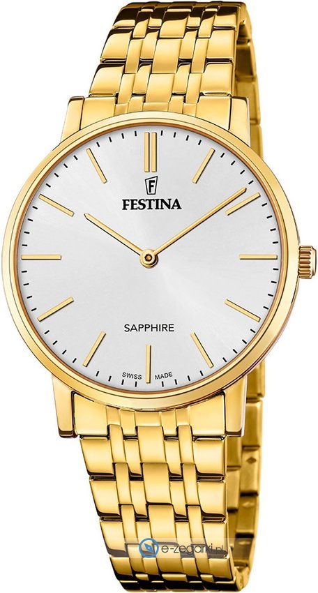Zegarek F20046-2 marki Festina to gustowny zegarek naręczny męski, który posiada ciekawe rozwiązania i funkcje. Model ten zalicza się do kolekcji Festina Classic Bracelet. Nieschematyczny wygląd czasomierza osiągnięto również dzięki tarczy w kolorze srebrnym. Zegarek ten prezentuje godzinę w formacie analogowym dzięki czemu odczyt jest bardzo łatwy. Koperta została pokryta kolorem złotym szeroka jest na 39 mm oraz ma grubość 7 mm - charakteryzuje się okrągłym kształtem.