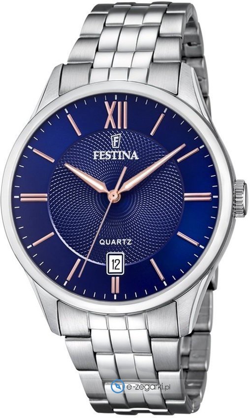 Zegarek F20425-5 marki Festina to elegancki zegarek naręczny męski, który jest wyposażony w pomysłowe rozwiązania oraz funkcje. Model ten jest z serii Festina Classic Bracelet. Cyferblat zegarka jest w kolorze niebieskim. Aktualna godzina pokazywana jest w sposób analogowy co intuicyjnie pozwala ją odczytać. Koperta szeroka jest na 43 mm oraz ma grubość 10 mm - posiada okrągły kształt.
