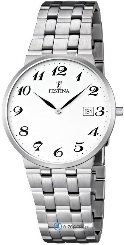 Model męski F6825-4 marki Festina z serii Festina Classic Bracelet. Wysokiej trwałości tarczę zegarka pokryto białym kolorem. Zegarek ten pokazuje godzinę w formacie analogowym dzięki czemu odczyt jest bezproblemowy. Koperta jest w kolorze srebrnym szeroka jest na 38 mm oraz ma grubość 6 mm - w kształcie okrągłym.