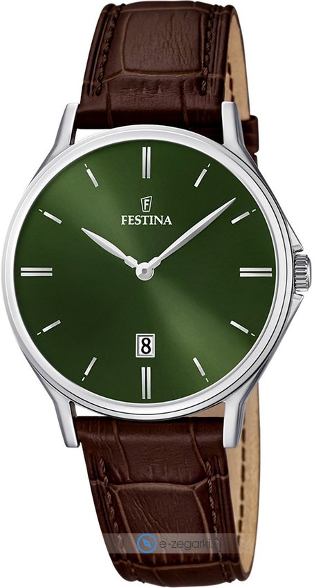 Model męski F16745-6 marki Festina to propozycja z kolekcji Festina Classic Strap. Zegarki z tej serii charakteryzują się ponadczasowym designem i wysoką jakością wykonania. Charakteru nadaje mu wysokiej klasy tarcza w kolorze zielonym. Zegarek ten pokazuje godzinę w formacie analogowym dzięki czemu odczyt jest bardzo łatwy. Koperta w kolorze srebrnym ma 39 mm szerokości i 7 mm grubości, wyróżnia się okrągłym kształtem.