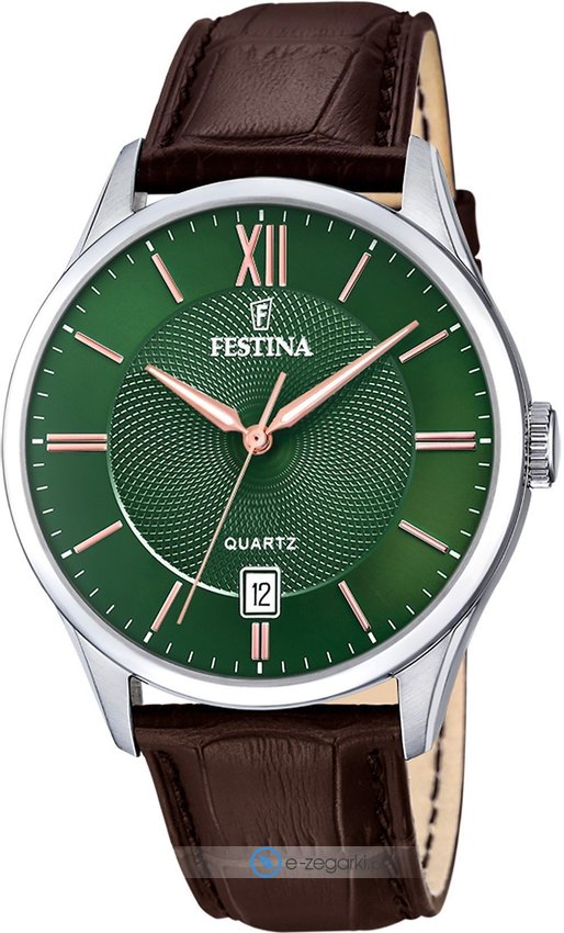 Festina F20426-8 to męski zegarek przeznaczony dla osób szukających zegarka z rodziny Festina Classic Strap. Atrakcyjną budowę czasomierza osiągnięto z pomocą tarczy w kolorze zielonym. Zegarek ten prezentuje godzinę w formacie analogowym dzięki temu odczyt jest bardzo łatwy. Koperta jest w kolorze srebrnym szeroka jest na 43 mm oraz ma grubość 11 mm - posiada okrągły kształt.