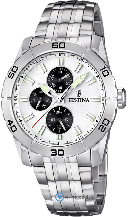 Zegarek męski F16606-1 marki Festina to ciekawa propozycja dla ludzi ceniących sobie dbałość o detale a także bezawaryjne funkcjonowanie mechanizmów. Charakter zapewnia wysokiej klasy cyferblat w kolorze srebrnym. Zaprezentowana metodą analogową aktualna godzina jest czytelna i prosta do odczytania. Koperta w barwach koloru srebrnego szeroka jest na 44 mm oraz ma grubość 12 mm - posiada okrągły kształt.