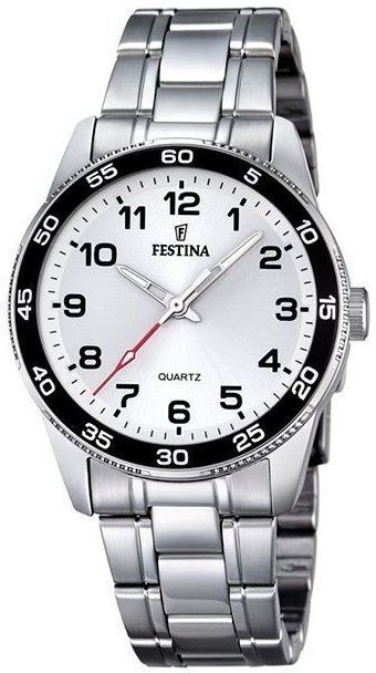 Zegarek F16905-1 marki Festina to stylowy zegarek naręczny męski, który jest wyposażony w ciekawe rozwiązania i funkcje. Model ten występuje w kolekcji Festina Junior. Styl zapewnia wysokiej jakości cyferblat w kolorze białym. Aktualna godzina pokazywana jest w sposób analogowy co intuicyjnie pozwala ją odczytać. Koperta jest w kolorze srebrnym szeroka jest na 34 mm oraz ma grubość 9 mm - w kształcie okrągłym.