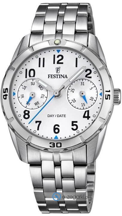 Zegarek męski F16908-1 marki Festina należy do rodziny Festina Junior. Wysokiej jakości tarczę zegarka pokryto białym kolorem. Pokazana metodą analogową bieżąca godzina jest czytelna i szybka do odczytania. Koperta jest w kolorze srebrnym szeroka jest na 33 mm oraz ma grubość 9 mm - w kształcie okrągłym.