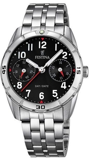 Zegarek męski F16908-3 marki Festina to idealne połączenie funkcjonalności i ciekawego designu. Model ten w gamie pozostałych zegarków tego producenta występuje w serii Festina Junior. Atrakcyjny wygląd zegarka uzyskano m.in. poprzez cyferblat w kolorze czarnym. Zegarek ten pokazuje godzinę w formacie analogowym dzięki czemu odczyt jest bezproblemowy. Koperta jest pokryta kolorem srebrnym szeroka jest na 33 mm oraz ma grubość 9 mm - w kształcie okrągłym.