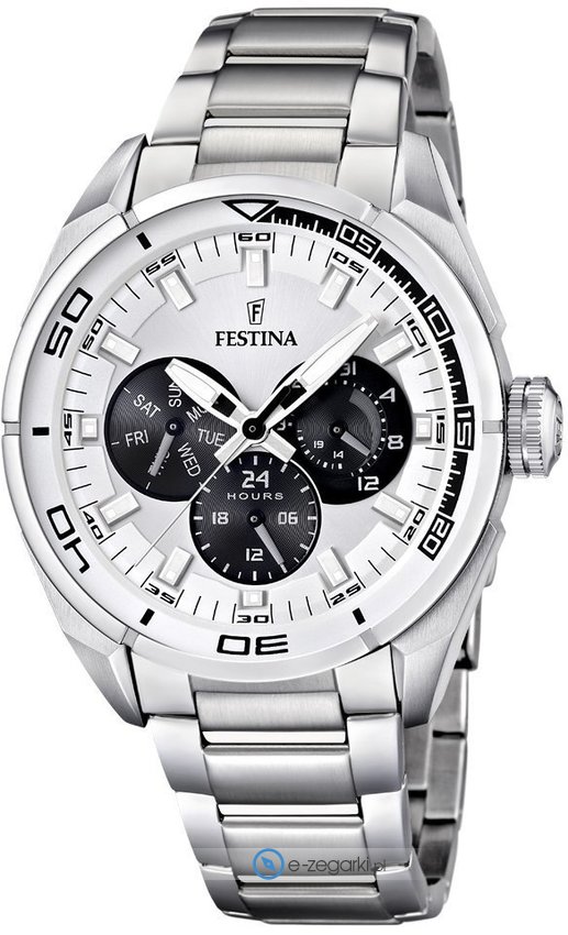 Zegarek męski F16608-1 marki Festina należy do serii Festina Multifunction. Ciekawy wygląd czasomierza uzyskano m.in. poprzez cyferblat w kolorze białym. Godzina zaprezentowana jest w sposób analogowy co bez trudu pozwala ją odczytać. Koperta jest w kolorze srebrnym szeroka jest na 44 mm oraz ma grubość 12 mm - w kształcie okrągłym.