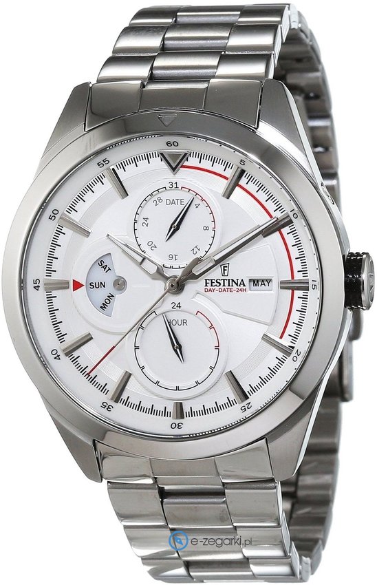 Model męski F16828-1 marki Festina z rodziny Festina Multifunction. Stylu nadaje wysokiej jakości tarcza w kolorze srebrnym. Zaprezentowana metodą analogową bieżąca godzina jest czytelna i prosta do sprawdzenia. Koperta w barwach koloru srebrnego szeroka jest na 42 mm oraz ma grubość 11 mm - w kształcie okrągłym.