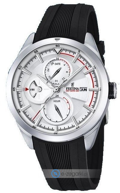 Zegarek męski F16829-1 z serii Festina Multifunction marki Festina. Wysokiej trwałości tarczę zegarka pokryto białym kolorem. Zegarek ten prezentuje aktualny czas w formacie analogowym dzięki temu odczyt jest bardzo łatwy. Koperta jest ozdobiona kolorem srebrnym szeroka jest na 41 mm oraz ma grubość 11 mm - posiada okrągły kształt.