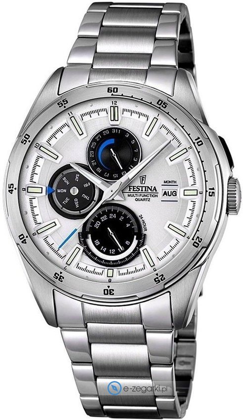 Zegarek F16876-1 marki Festina to elegancki zegarek naręczny męski, który wyposażono w pomysłowe rozwiązania i funkcje. Model ten pochodzi z serii Festina Multifunction. Niestereotypowy wygląd czasomierza uzyskano także dzięki tarczy w kolorze białym. Zegarek ten pokazuje godzinę w formacie analogowym dzięki temu odczyt jest intuicyjny. Koperta jest w kolorze srebrnym szeroka jest na 43 mm oraz ma grubość 11 mm - posiada okrągły kształt.