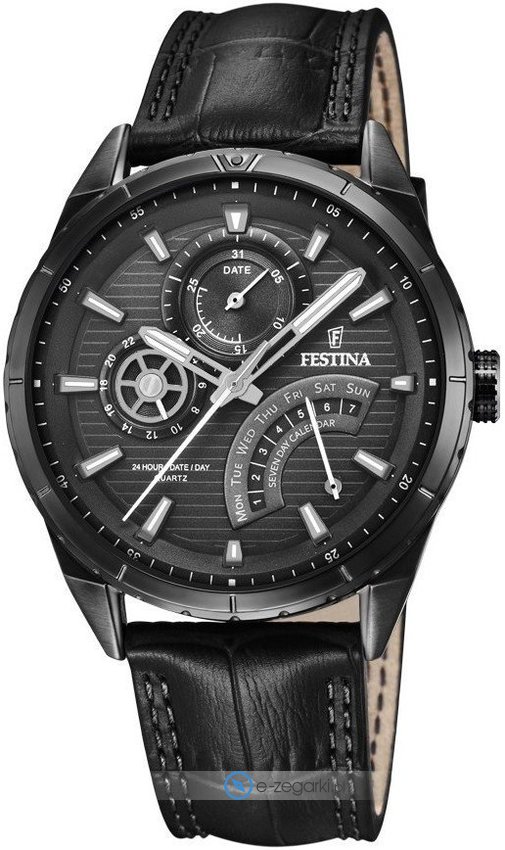 Model męski F16989-1 marki Festina należy do kolekcji Festina Multifunction. Niestereotypowy wygląd czasomierza osiągnięto także dzięki tarczy w kolorze czarnym. Aktualna godzina prezentowana jest w sposób analogowy co intuicyjnie pozwala ją odczytać. Koperta jest w kolorze czarnym szeroka jest na 41 mm oraz ma grubość 11 mm - cechuje się okrągłym kształtem.
