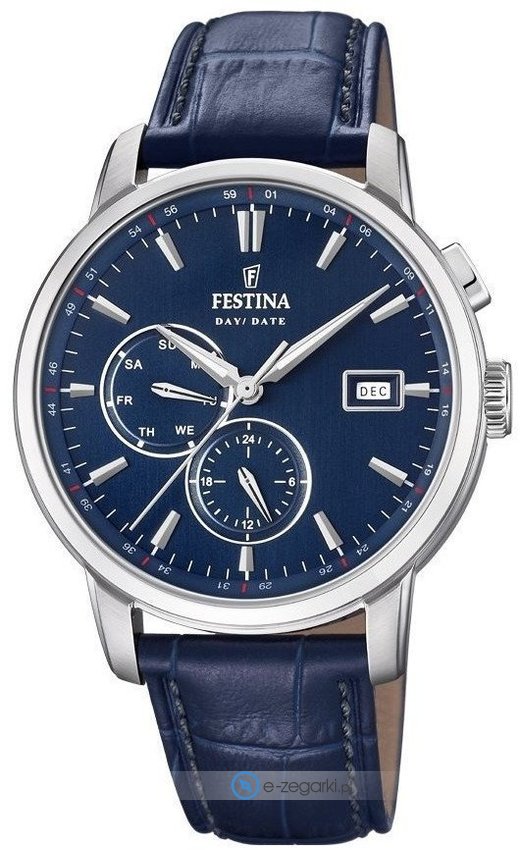 Zegarek F20280-3 marki Festina to gustowny zegarek naręczny męski, który posiada pomysłowe rozwiązania oraz funkcje. Model ten zalicza się do serii Festina Multifunction. Niestereotypowy wygląd czasomierza osiągnięto również dzięki tarczy w kolorze niebieskim. Aktualna godzina pokazywana jest w sposób analogowy co niezmiernie łatwo pozwala ją odczytać. Koperta jest pokryta kolorem srebrnym szeroka jest na 42 mm oraz ma grubość 11 mm - w kształcie okrągłym.