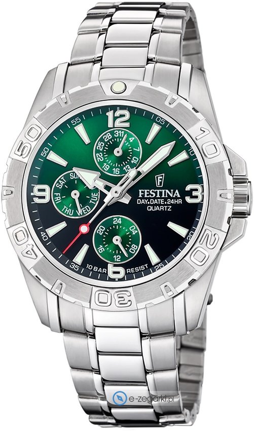 Zegarek męski F20666-3 marki Festina to stylowe połączenie funkcjonalności a także modnego wzornictwa. Model ten należy do kolekcji Festina Multifunction. Cyferblat zegarka jest w kolorze zielonym. Pokazana metodą analogową aktualna godzina jest czytelna i łatwa do odczytania. Koperta w odcieniach koloru srebrnego szeroka jest na 40 mm oraz ma grubość 12 mm - cechuje się okrągłym kształtem.