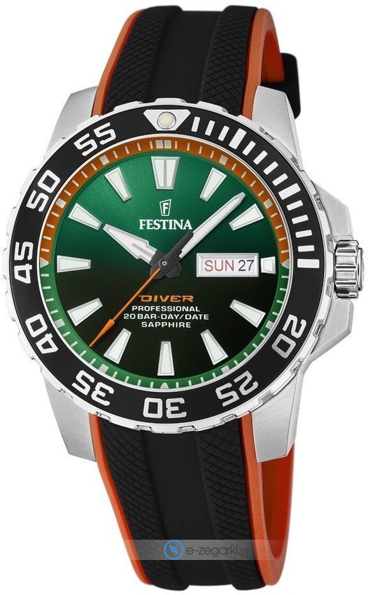 Zegarek męski F20662-2 marki Festina należy do kolekcji Festina Originals. Charakteru nadaje wysokiej jakości cyferblat w kolorze zielonym. Aktualna godzina przedstawiona jest w sposób analogowy co bez trudu pozwala ją odczytać. Koperta jest pokryta kolorem srebrnym szeroka jest na 45 mm - w kształcie okrągłym.