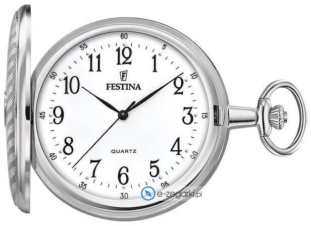Zegarek F2021-1 - kieszonkowy marki Festina to gustowny zegarek naręczny męski, który jest wyposażony w pomysłowe rozwiązania oraz funkcje. Model ten jest z serii Festina Pocket. Cyferblat zegarka jest w kolorze białym. Aktualna godzina zaprezentowana jest w sposób analogowy co intuicyjnie pozwala ją odczytać. Koperta jest w kolorze srebrnym szeroka jest na 49 mm oraz ma grubość 11 mm - w kształcie okrągłym.