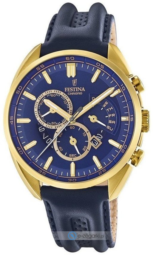 Zegarek męski F20268-2 marki Festina z rodziny Festina Prestige. Tarcza zegarka jest w kolorze niebieskim. Zaprezentowana metodą analogową aktualna godzina jest czytelna i prosta do odczytania. Koperta w barwach koloru złotego szeroka jest na 42 mm oraz ma grubość 12 mm - ma okrągły kształt.