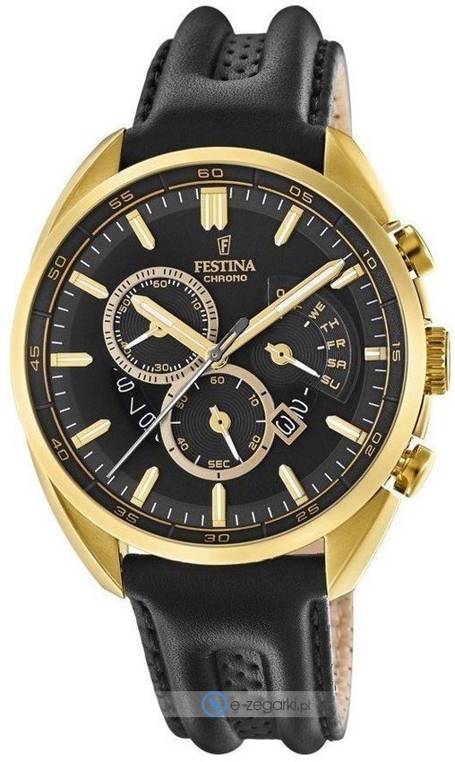 Model męski F20268-3 należy do serii Festina Prestige marki Festina. Styl zapewnia wysokiej klasy tarcza w kolorze czarnym. Godzina przedstawiona jest w sposób analogowy co intuicyjnie pozwala ją odczytać. Koperta jest pokryta kolorem złotym szeroka jest na 42 mm oraz ma grubość 12 mm - charakteryzuje się okrągłym kształtem.
