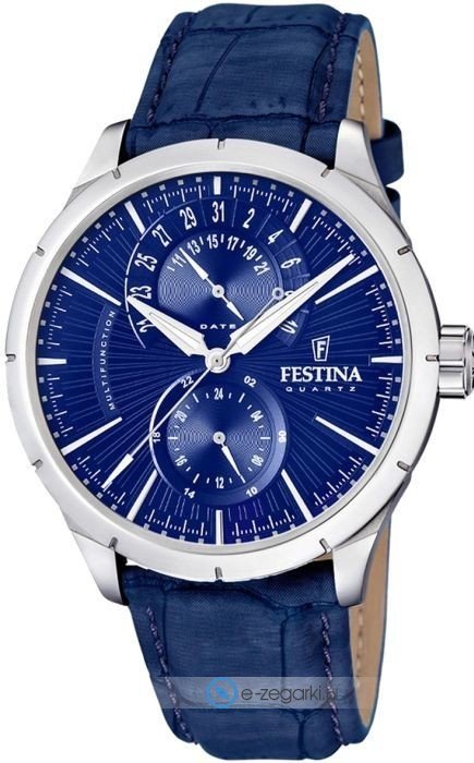 Zegarek męski F16573-7 marki Festina to stylowe połączenie funkcjonalności a także ciekawego designu. Model ten w gamie pozostałych zegarków tego producenta występuje w kolekcji Festina Retro. Cyferblat zegarka jest w kolorze granatowym. Zegarek ten pokazuje godzinę w formacie analogowym dzięki temu odczyt jest bardzo łatwy. Koperta jest w kolorze srebrnym szeroka jest na 45 mm oraz ma grubość 11 mm - cechuje się okrągłym kształtem.