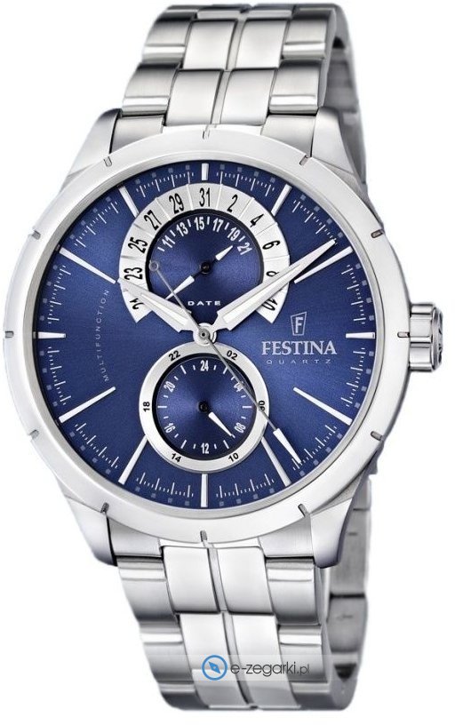 Męski zegarek F16632-2 z serii Festina Retro marki Festina to połączenie smaku i nieprzeciętnych funkcji. Cyferblat zegarka jest w kolorze niebieskim. Zegarek ten prezentuje godzinę w formacie analogowym dzięki czemu odczyt jest bezproblemowy. Koperta jest w kolorze srebrnym szeroka jest na 45 mm oraz ma grubość 12 mm - charakteryzuje się okrągłym kształtem.