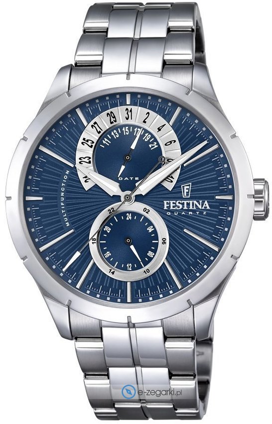 Zegarek F16632-A marki Festina to stylowy zegarek naręczny męski, który wyposażono w pomysłowe rozwiązania oraz funkcje. Model ten należy do kolekcji Festina Retro. Tarcza zegarka jest w kolorze niebieskim. Zaprezentowana metodą analogową aktualna godzina jest czytelna i prosta do sprawdzenia. Koperta szeroka jest na 45 mm - w kształcie okrągłym.