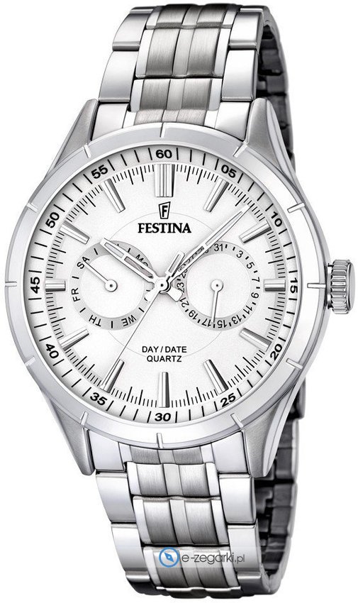 Zegarek męski F16780-1 marki Festina to stylowe połączenie funkcjonalności oraz ciekawego wzornictwa. Model ten w gamie innych zegarków tego producenta występuje w kolekcji Festina Retro. Wysokiej trwałości tarczę zegarka pokryto białym kolorem. Pokazana metodą analogową bieżąca godzina jest czytelna i szybka do sprawdzenia. Koperta jest w kolorze srebrnym szeroka jest na 44 mm oraz ma grubość 12 mm - cechuje się okrągłym kształtem.
