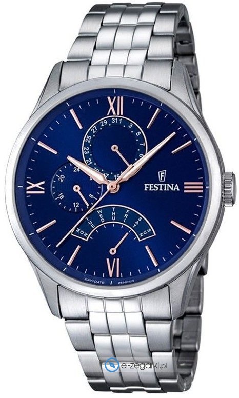 Festina F16822-3 - męski zegarek przeznaczony dla osób szukających zegarka z serii Festina Retro. Stylu dodaje wysokiej klasy cyferblat w kolorze niebieskim. Pokazana metodą analogową aktualna godzina jest czytelna i prosta do sprawdzenia. Koperta w barwach koloru srebrnego szeroka jest na 44 mm oraz ma grubość 11 mm - w kształcie okrągłym.