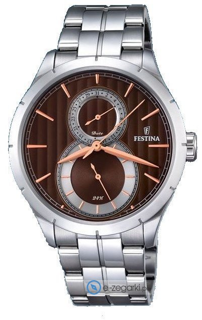 Model męski F16891-5 marki Festina należy do rodziny Festina Retro. Atrakcyjny wygląd czasomierza osiągnięto m.in. poprzez tarczę w kolorze brązowym. Zegarek ten prezentuje godzinę w formacie analogowym dzięki czemu odczyt jest intuicyjny. Koperta jest w kolorze srebrnym szeroka jest na 46 mm oraz ma grubość 11 mm - w kształcie okrągłym.