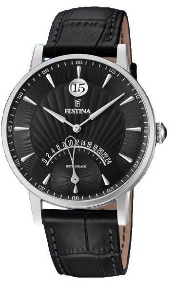 Zegarek F16984-4 marki Festina to gustowny zegarek naręczny męski, który jest wyposażony w ciekawe rozwiązania oraz funkcje. Model ten zalicza się do kolekcji Festina Retro. Charakteru nadaje wysokiej jakości tarcza w kolorze czarnym. Zegarek ten pokazuje godzinę w formacie analogowym dzięki czemu odczyt jest bezproblemowy. Koperta jest w kolorze srebrnym szeroka jest na 41 mm oraz ma grubość 12 mm - posiada okrągły kształt.