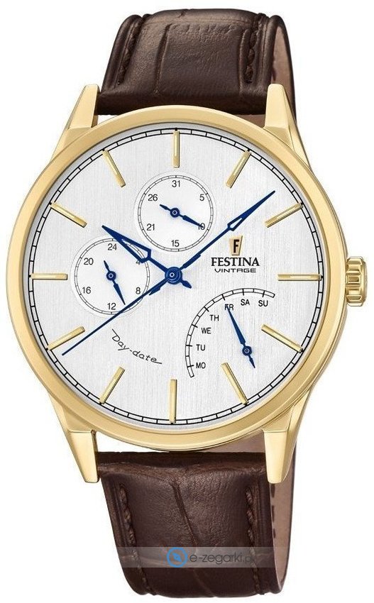 Zegarek męski F20279-1 marki Festina to idealne połączenie funkcjonalności i ciekawego wzornictwa. Model ten pochodzi z kolekcji Festina Retro. Styl zapewnia wysokiej jakości cyferblat w kolorze srebrnym. Zegarek ten pokazuje godzinę w formacie analogowym dzięki temu odczyt jest bardzo łatwy. Koperta w barwach koloru złotego szeroka jest na 42 mm oraz ma grubość 11 mm - wyróżnia się okrągłym kształtem.