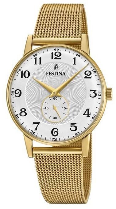 Męski zegarek F20569-1 z kolekcji Festina Retro marki Festina to połączenie stylu i pomysłowych funkcji. Ciekawą stylistykę zegarka uzyskano z pomocą tarczy w kolorze białym. Zaprezentowana metodą analogową aktualna godzina jest czytelna i prosta do odczytania. Koperta została ozdobiona kolorem złotym szeroka jest na 36 mm - posiada okrągły kształt.