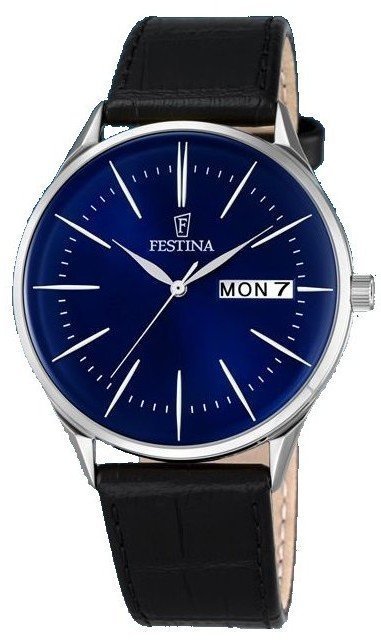 Model męski F6837-3 marki Festina należy do serii Festina Retro. Wysokiej trwałości tarczę zegarka pokryto niebieskim kolorem. Zegarek ten pokazuje aktualny czas w formacie analogowym dzięki czemu odczyt jest bezproblemowy. Koperta w barwach koloru srebrnego szeroka jest na 42 mm oraz ma grubość 11 mm - posiada okrągły kształt.