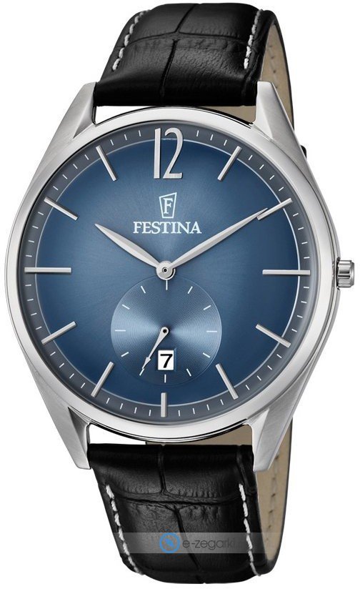 Festina F6857-3 - męski zegarek przeznaczony dla osób szukających zegarka z rodziny Festina Retro. Charakterystyczną stylistykę zegarka osiągnięto dzięki tarczy w kolorze niebieskim. Aktualna godzina przedstawiona jest w sposób analogowy co niezmiernie łatwo pozwala ją odczytać. Koperta w odcieniach koloru srebrnego szeroka jest na 41 mm oraz ma grubość 11 mm - wyróżnia się okrągłym kształtem.