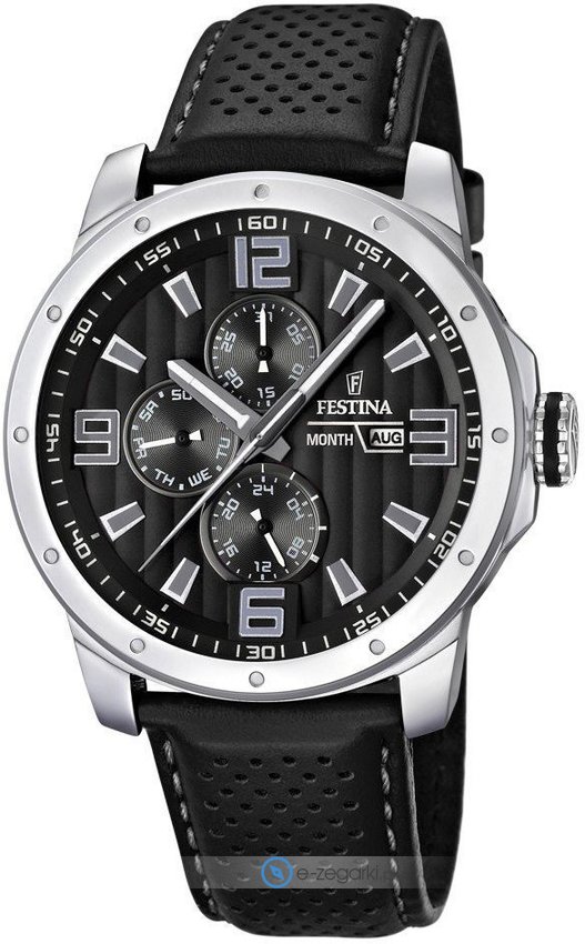 Zegarek męski F16585-4 marki Festina to dobre połączenie funkcjonalności i modnego designu. Model ten pochodzi z kolekcji Festina Sport. Wysokiej trwałości tarczę zegarka pokryto czarnym kolorem. Aktualna godzina pokazywana jest w sposób analogowy co niezmiernie łatwo pozwala ją odczytać. Koperta w odcieniach koloru srebrnego szeroka jest na 45 mm oraz ma grubość 12 mm - charakteryzuje się okrągłym kształtem.