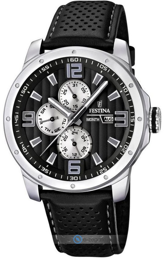 Zegarek F16585-9 marki Festina to gustowny zegarek naręczny męski, który posiada ciekawe rozwiązania i funkcje. Model ten pochodzi z serii Festina Sport. Styl zapewnia wysokiej klasy tarcza w kolorze czarnym. Zegarek ten pokazuje godzinę w formacie analogowym dzięki temu odczyt jest bardzo łatwy. Koperta jest ozdobiona kolorem srebrnym szeroka jest na 45 mm oraz ma grubość 12 mm - ma okrągły kształt.